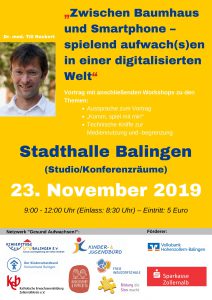 Das Netzwerk „Gesund Aufwachsen!“ lädt am Samstag, 23.11. von 9 Uhr bis 12 Uhr unter dem Motto „Zwischen Baumhaus und Smartphone – Spielend aufwach(s)en in einer digitalisierten Welt“ zu einem Vortrag von Dr. med. Till Reckert und anschließenden Kurz-Workshops in die Stadthalle (Studio/Konferenzräume) ein.