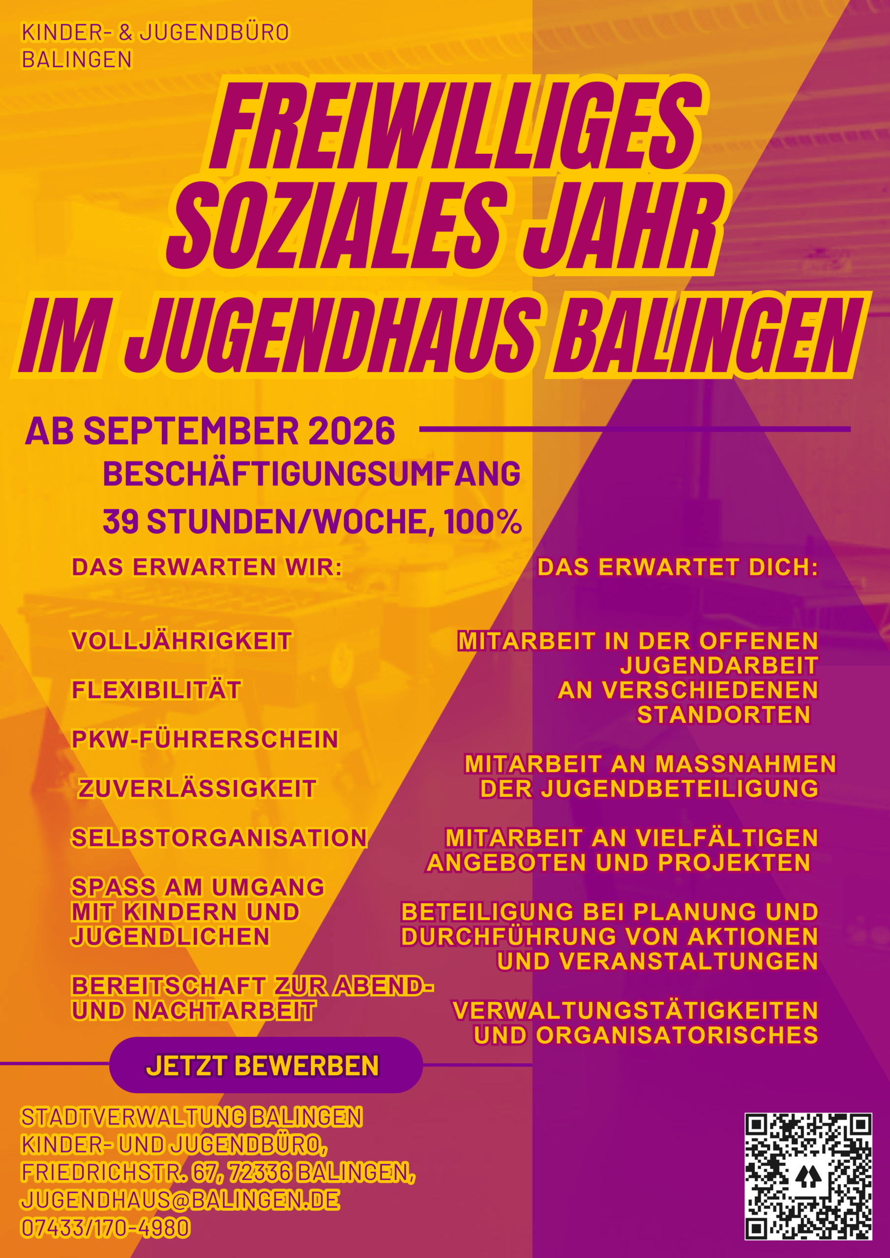 Schwerpunkt der Tätigkeit liegt im Jugendhaus Balingen. Während des FSJs besuchen die Freiwilligen insgesamt 25 Bildungstage, bei denen die Seminare vom AWO-Bundesverband durchgeführt werden. Nach erfolgreicher Beendigung des FSJs wird ein entsprechendes Zeugnis ausgehändigt.